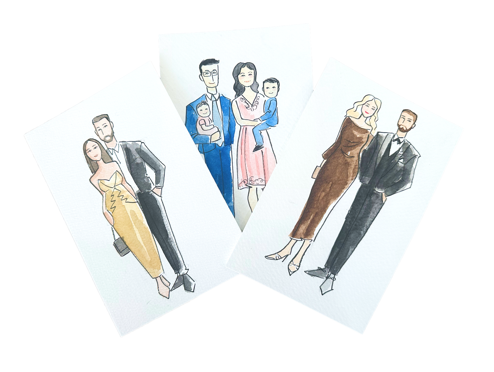 Paintings are created in a loose, expressive watercolor style. Variations in likeness are a natural part of the live art process.